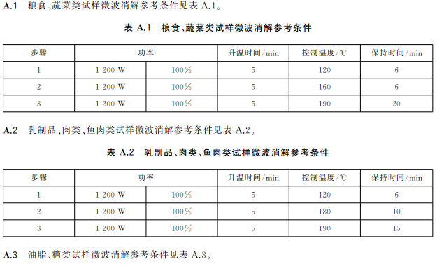 蔬菜、水果等含水分高的樣品,稱(chēng)取2.0g~4.0g(精確至0.001g)樣品于消解罐中,加入5mL硝酸,放置30min;糧食、肉類(lèi)、魚(yú)類(lèi)等樣品,稱(chēng)取0.2g~0.5g(精確至0.001g)樣品于消解罐中,加入5mL硝酸,放置30min,蓋好安全閥,將消解罐放入微波消解系統(tǒng)中,根據(jù)不同類(lèi)型的樣品,設(shè)置適宜的微波消解程序(見(jiàn)表A.1~表A.3),按相關(guān)步驟進(jìn)行消解,消解完全后趕酸,將消化液轉(zhuǎn)移至25mL容量瓶或比色管中,用少量水洗滌內(nèi)罐3次,合并洗滌液并定容至刻度,混勻。同時(shí)作空白試驗(yàn)。