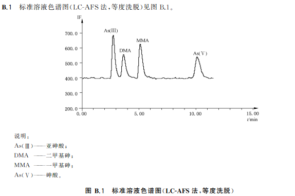 取7支10mL容量瓶,分別準(zhǔn)確加入1.00mg/L混合標(biāo)準(zhǔn)使用液0.00mL、0.050mL、O.10mL、0.20mL、0.30mL、0.50mL和1.0mL,加水稀釋至刻度,此標(biāo)準(zhǔn)系列溶液的濃度分別為0.0ng/mL、5.0ng/mL、10ng/mL、20ng/mL、30ng/mL、50ng/mL和100ng/mL吸取標(biāo)準(zhǔn)系列溶液100μL注入液相色譜-原子熒光光譜聯(lián)用儀進(jìn)行分析,得到色譜圖,以保留時(shí)間定性。以標(biāo)準(zhǔn)系列溶液中目標(biāo)化合物的濃度為橫坐標(biāo),色譜峰面積為縱坐標(biāo),繪制標(biāo)準(zhǔn)曲線(xiàn)。標(biāo)準(zhǔn)溶液色譜圖見(jiàn)附錄B中的圖B.1、圖B.2。