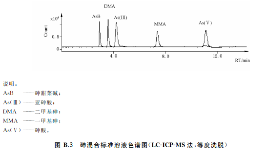 色譜柱:陰離子交換色譜柱(柱長(zhǎng)250mm,內(nèi)徑4mm),或等效柱。陰離子交換色譜保護(hù)柱(柱長(zhǎng)10mm,內(nèi)徑4mm),或等效柱流動(dòng)相組成a)等度洗脫流動(dòng)相:15mmol/L磷酸二氫銨溶液(pH6.0),流動(dòng)相洗脫方式等度洗脫。流動(dòng)相流速:1.0mL/min;進(jìn)樣體積:100!L。等度洗脫適用于稻米及稻米加工食品b)梯度洗脫:流動(dòng)相A:1mmol/L磷酸二氫銨溶液(pH9.0);流動(dòng)相B:20mmol/L磷酸二氫銨溶液(pH8.0)。(梯度洗脫程序見(jiàn)附錄A中的表A.4。)流動(dòng)相流速:1.0mL/min;進(jìn)樣體積100μL。梯度洗脫適用于水產(chǎn)動(dòng)物樣品、含水產(chǎn)動(dòng)物組成的樣品、含藻類(lèi)等海產(chǎn)植物的樣品以及嬰。