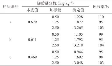 選取3種糖廠濾泥樣品,編號(hào)分別為a、b和c,分別加入低、中和高3個(gè)濃度水平的銻標(biāo)準(zhǔn)溶液,按1.4方法進(jìn)行樣品處理,按照1.5方法分別測(cè)定,結(jié)果見(jiàn)表5。由表5可知,樣品加標(biāo)回收率為95%~110%,表明該方法具有較高的準(zhǔn)確度。